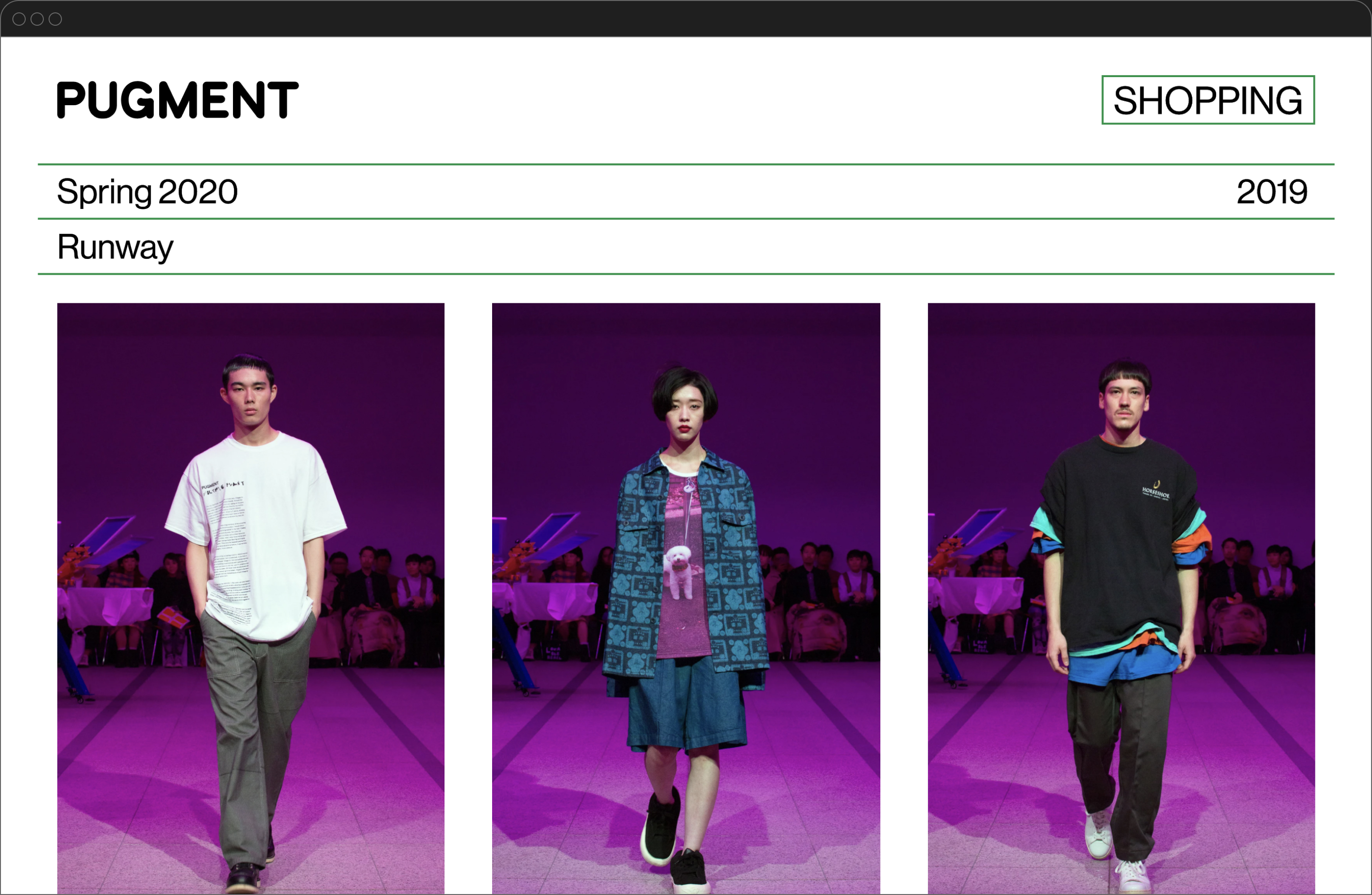 新進気鋭のファッションレーベルPUGMENTのwebサイトを制作した。 インターネットショッピングの機能を入れるにあたって、Shopifyというサービスを利用している。webフォントは節約のために1ウェイトのみとした。(Akzidenz Grotesk ) 「イメージを見ていること、テキストを読んでいること」自体を意識させること、それは、服を着るという行為をもう一度意識させる着心地の悪さと符合する。