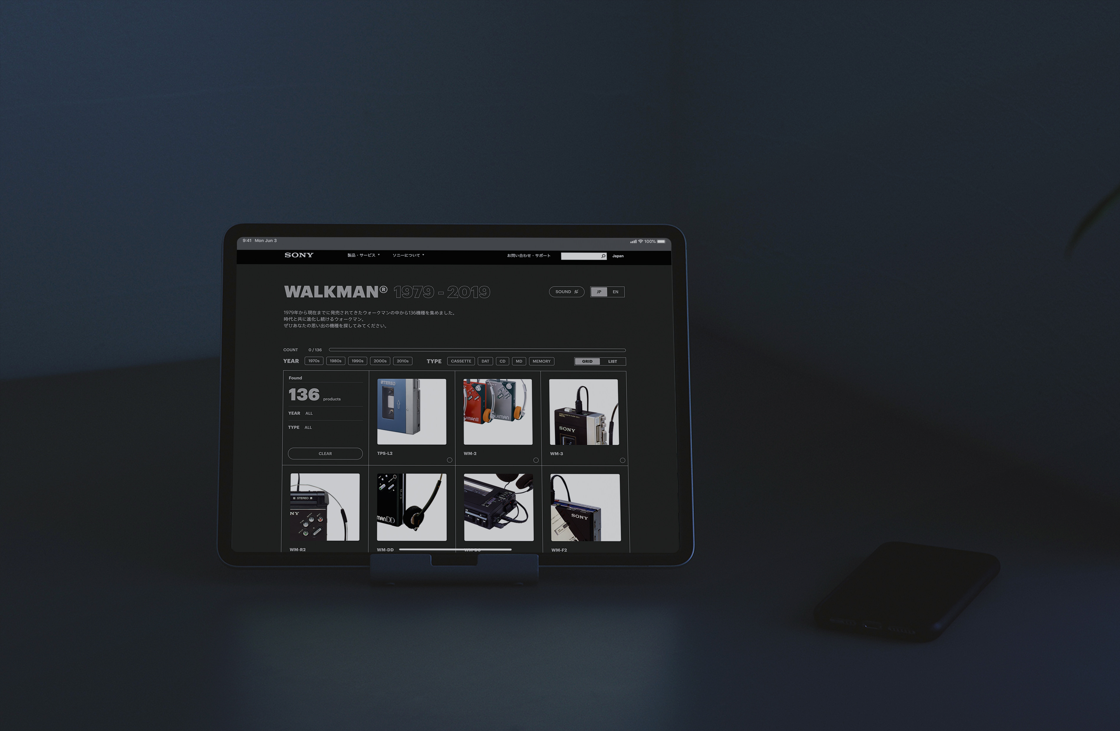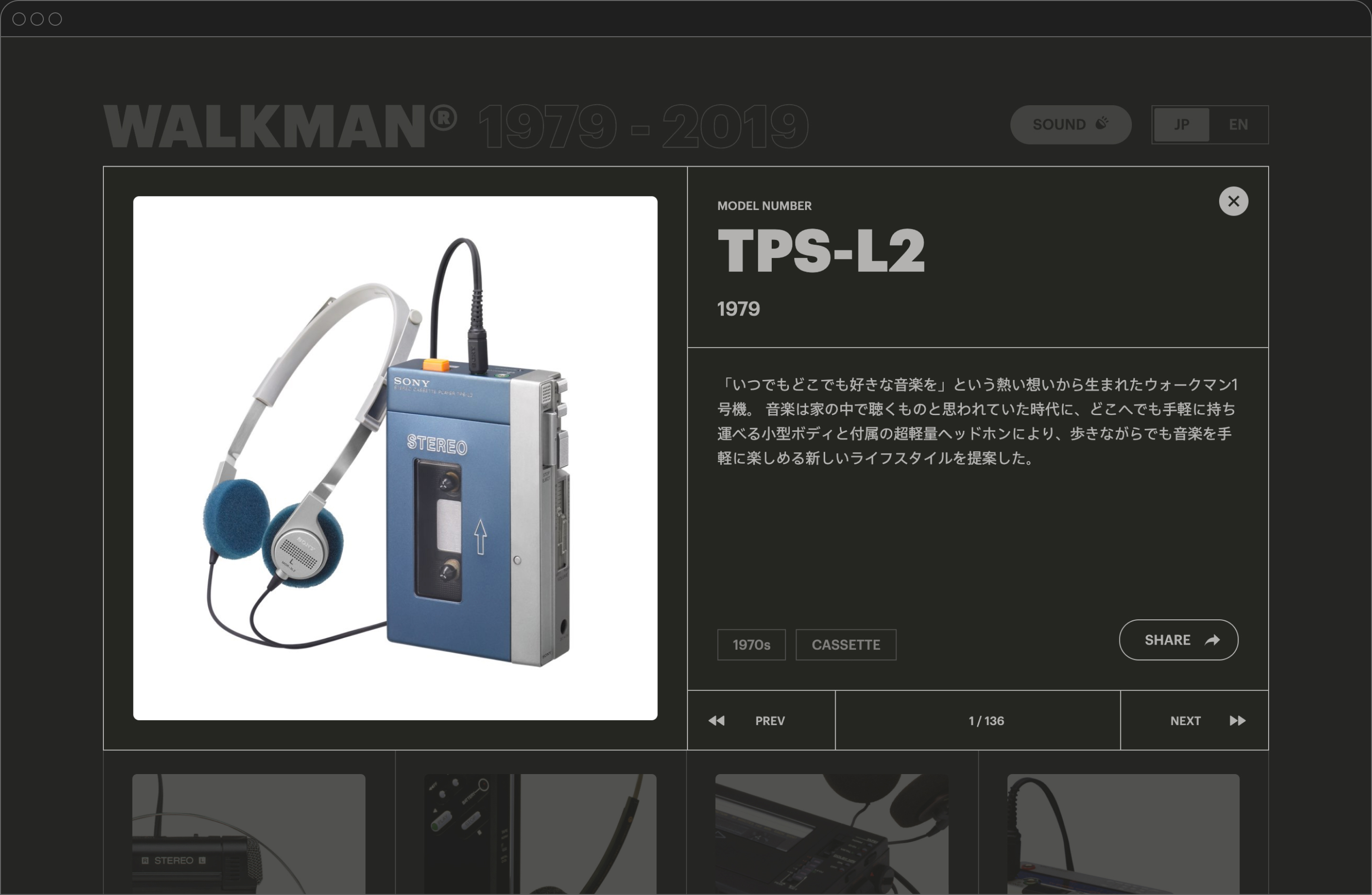 SONYのWALKMAN40周年を記念して、今までの革新的なプロダクトを振り返るwebサイト。 デザインは、過去のソニーのプロダクトに敬意を込めて黒い筐体に白いインクで文字や情報が載るようなものにしている。 また、エフェクトや効果などは90年代のゲームを参考にしつつ少し懐かしくなるような雑味を出している。 ソニーのwebサイト制作のレギュレーションである横幅1190pxの中にコンテンツを収めるというのは、いわゆる全画面のギャラリーサイトを作ろうとしていた当初においてはかなり厳しいものだった。しかし、そこを発想の起点にしようとした結果、横幅が狭く見えることを隠すのではなくむしろ強調すること、クラシックな印象のwebサイトになるが各種演出もクラッシックなものを採用することでサイトのコンセプトがより明解になった。 クラシックなデザインでありながらも、実装はSPAを採用してシームレスな遷移をしていたりwebデザインの歴史を参照しながらも、モダンなものを取り入れている。また、操作音に実際のWALKMANのボタンを押した音や、カセットの蓋を開ける音などを録音したものを使っている。そうすることで、スマートフォンでサイトを見たときにサイズ感などからカセットのWALKMANを操作しているような感覚に近づくことを目指している。